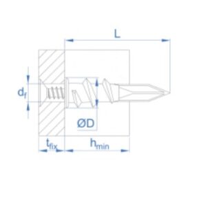 | Código | Longitud del Taco (L) | ØD: Diámetro de Cabeza del Taco | df: Diámetro en el Elemento a Fijar | hmin: Espesor del Material Base (mín.-máx.) | tfix: Espesor Máximo a Fijar | Punta de Instalación | Profundidad Mínima de la Cavidad | Tonillo Recomendado |