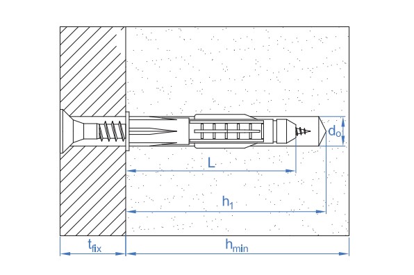 | Código | Ød0: Diámetro del taladro (mm) | L: Longitud (mm) | h1: Profundidad del taladro (mm) | hmin: Mínimo espesor del material base (mm) | Tornillo recomendado (mm) | ||||