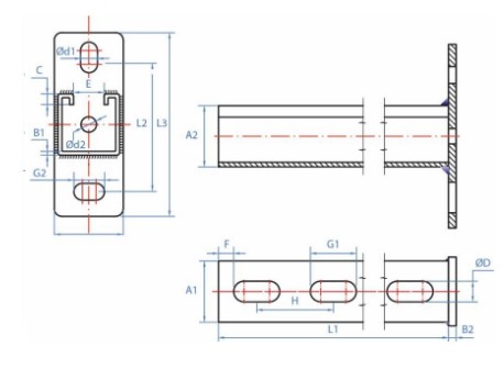 | Código | A1 | A2 | B1 | B2 | C | ØD | Ød1 | Ød2 | E | F | G1 | G2 | H | L1 | L2 | L3 |